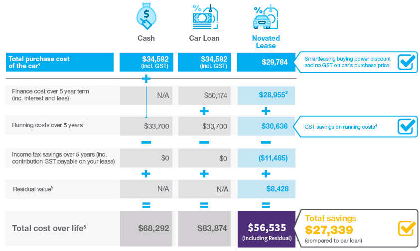 3. The novated lease finance cost includes a Smartleasing administration fee of $850, which has been used for illustrative purposes only. The actual Smartleasing administration fee applicable to your novated lease may differ as it will be dependent on your employer’s salary packaging plan.
